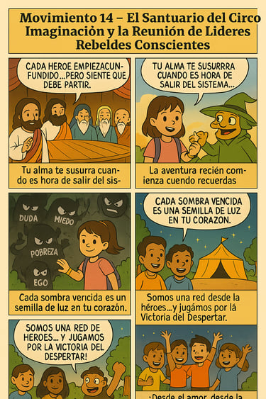 El movimiento 14 narra cómo en medio del fuego solar y la vibración creadora del arte y la verdad se activó el Santuario del Circo Imaginación: un templo vivo, físico y espiritual para la Red Astral de mentorías, arte y despertar planetario. Este Santuario nace en Previ Rico como una base real del Juego 369 y de los Valores del Verso. Y aunque aún hay tierra en el suelo y cables en el aire, ya vibra como un dojo sagrado de estrategias místicas y liderazgo rebelde.